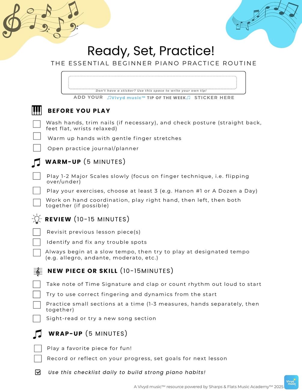 This cheerful 1-page printable checklist is designed to help beginners track their weekly piano goals with joy—not overwhelm. Now updated with 8 drag-and-drop Vivyd Tip Stickers that add motivation and magic to each new week!